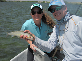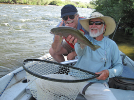 The bead-head stuff has been very successful most days. They were all over the pearl Lightning Bug (size #16) today. We’re also seeing some good action on Prince Nymphs, Electric Caddis pupa and rainbow warriors for the small stuff. Nocturnal stonefly shucks have been appearing on the banks in the morning so it most likely won’t be a bad bet to run a tan/brown Pat’s Rubberleg or a Delektable Braided Stone in the same colors along with one of the small bugs.