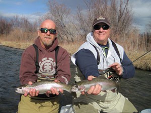 here, hoping to see you all again this year as we kick off the new season! It’s March and the weather is absolutely gorgeous out for it being spring. All the action is still below McAtee Bridge as the Upper Upper Madison is closed for spawning until the 16th of May. The squalla are moving around now and the fish are gobbling them down hard. The Delektable Mega Prince in Olive and Standard, the Delektable Grey Hurless and Pat’s Rubber Legs all in sizes 6 and 8 are working really well with a caddis nymph or May Fly underneath. Double stonefly rigs are working well without weight. Caddis are always a good choice to fish with anytime of year around here. There are many caddis patterns out there that would probably work well, but the hot ones we are using are the Delektable Olive Big Spanker size 14 and 16,